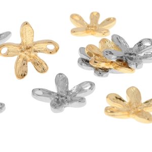 Flower with five petals Metallic element made of metal Z.A.M.A.K. in two colors - gold and silver plating. With two openings, they function as a link for the bindings. Dimensions length 1.7 cm, height 1.7 cm.