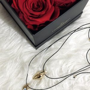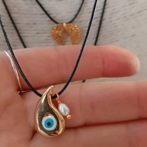 “Lahouri Eye Necklace” is a beautiful gold plated necklace with an enamel eye and freshwater pearl detail. The necklace is attached to a leatherette cord with a macrame clasp, which you can adjust to fit just right around your neck.
