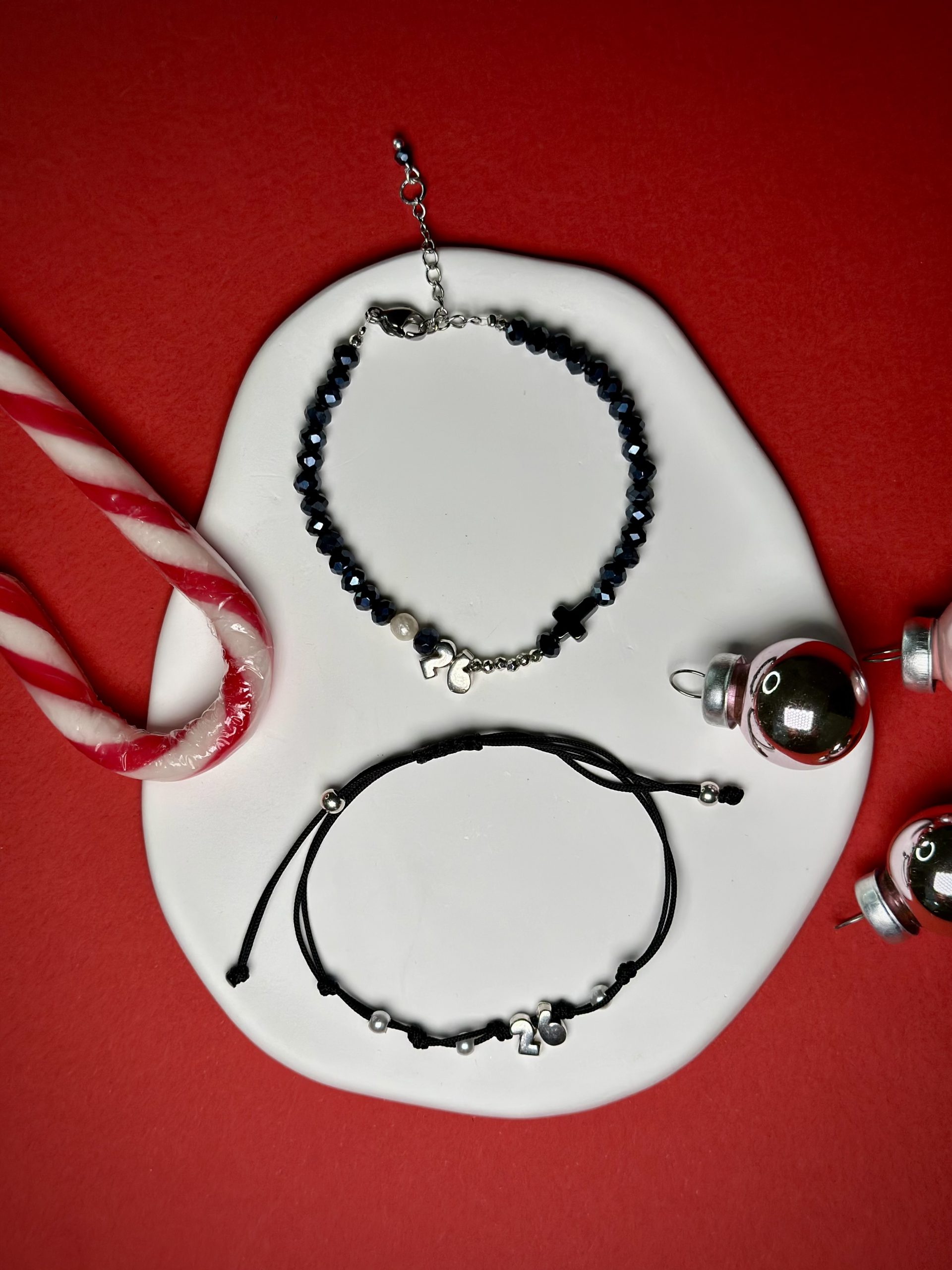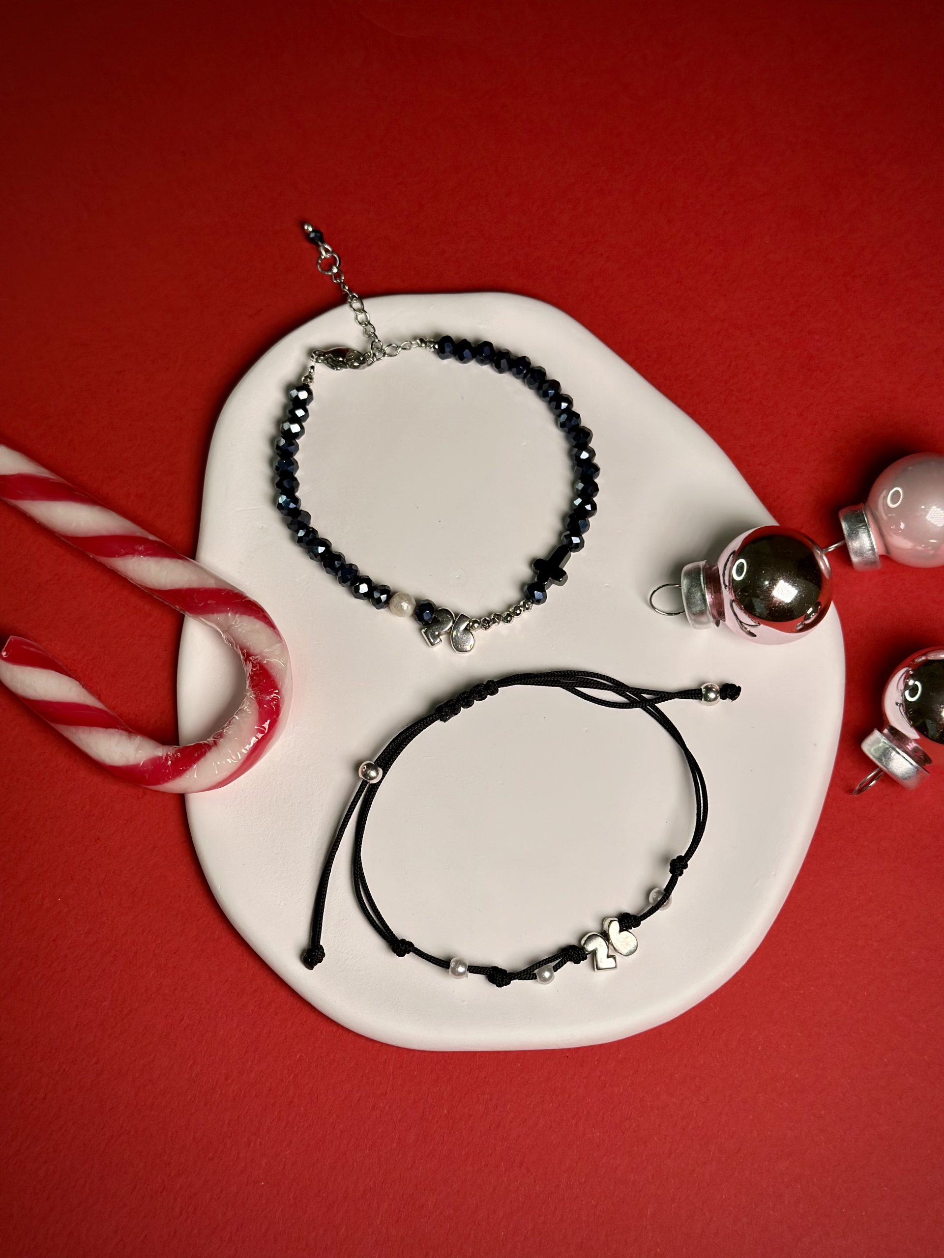 Το δεύτερο βραχιόλι, με μαύρο κορδόνι υψηλής αντοχής και μεταλλικά charms που σχηματίζουν τον αριθμό 26, αυξομειώνεται εύκολα χάρη στο μακραμέ κούμπωμά του — μια ευχή που προσαρμόζεται στον καρπό και στις στιγμές σας.
