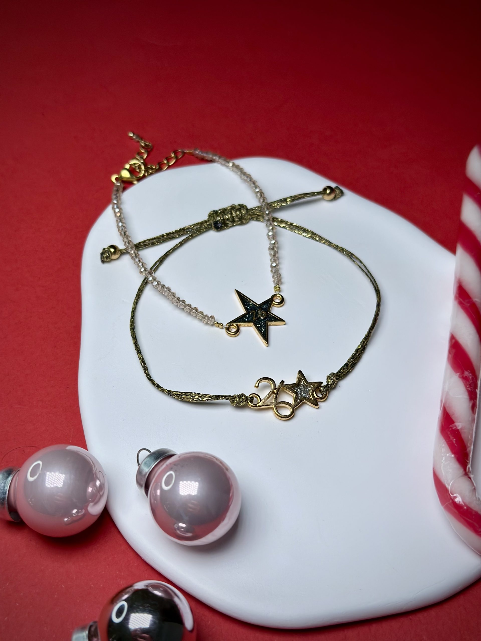 Το δεύτερο βραχιόλι είναι δεμένο με χρυσό κορδόνι υψηλής αντοχής και φέρει μεταλλικό charm “26” με μικρό αστεράκι, που λαμπυρίζει διακριτικά στο φως. Το μακραμέ κούμπωμά του επιτρέπει εύκολη αυξομείωση, ώστε να προσαρμόζεται άψογα σε κάθε καρπό.