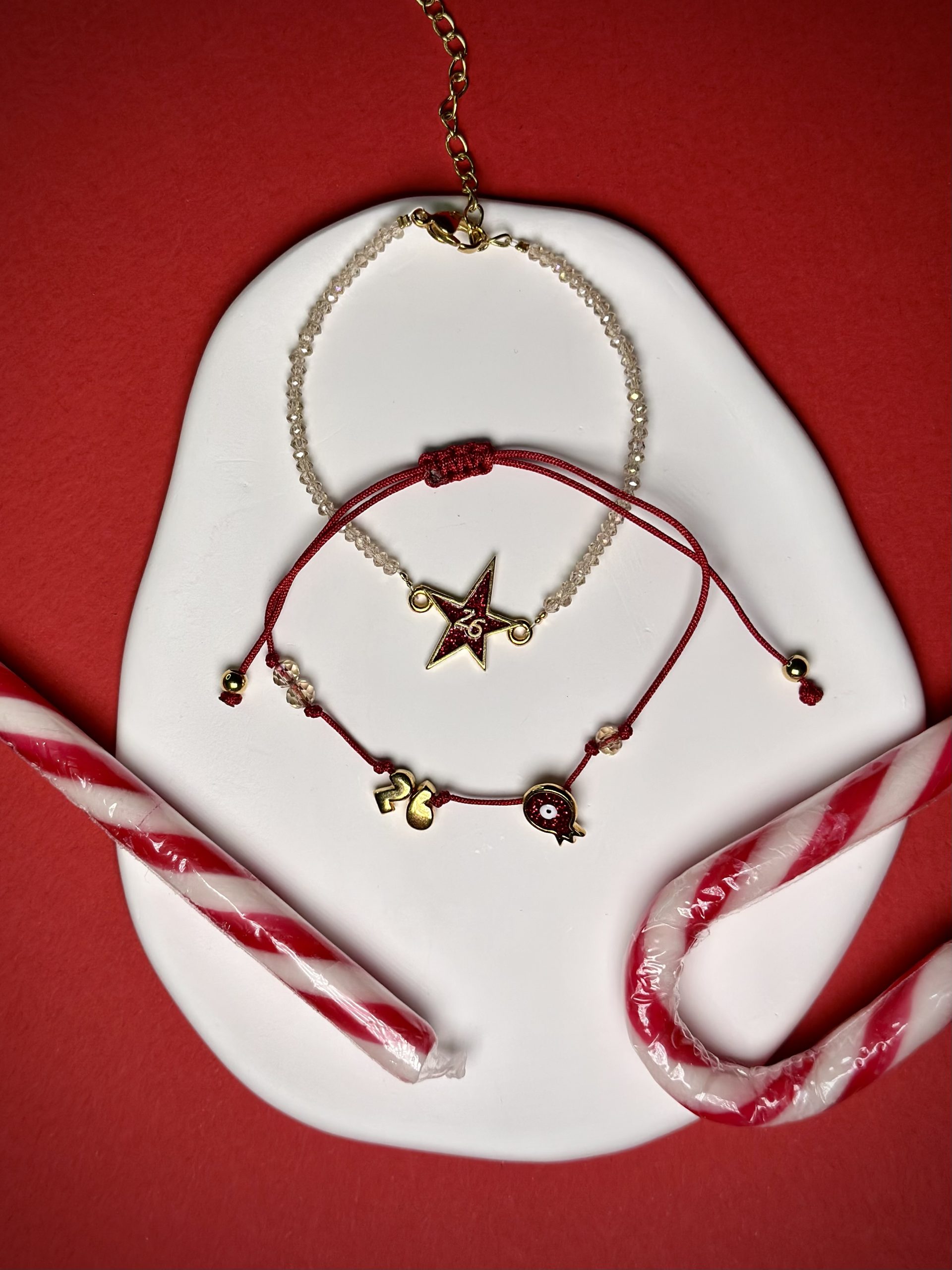 Δύο γυναικεία γούρια–βραχιόλια στην τιμή του ενός, φτιαγμένα για να φωτίζουν τον καρπό σας με εορταστική λάμψη και αισιοδοξία.
