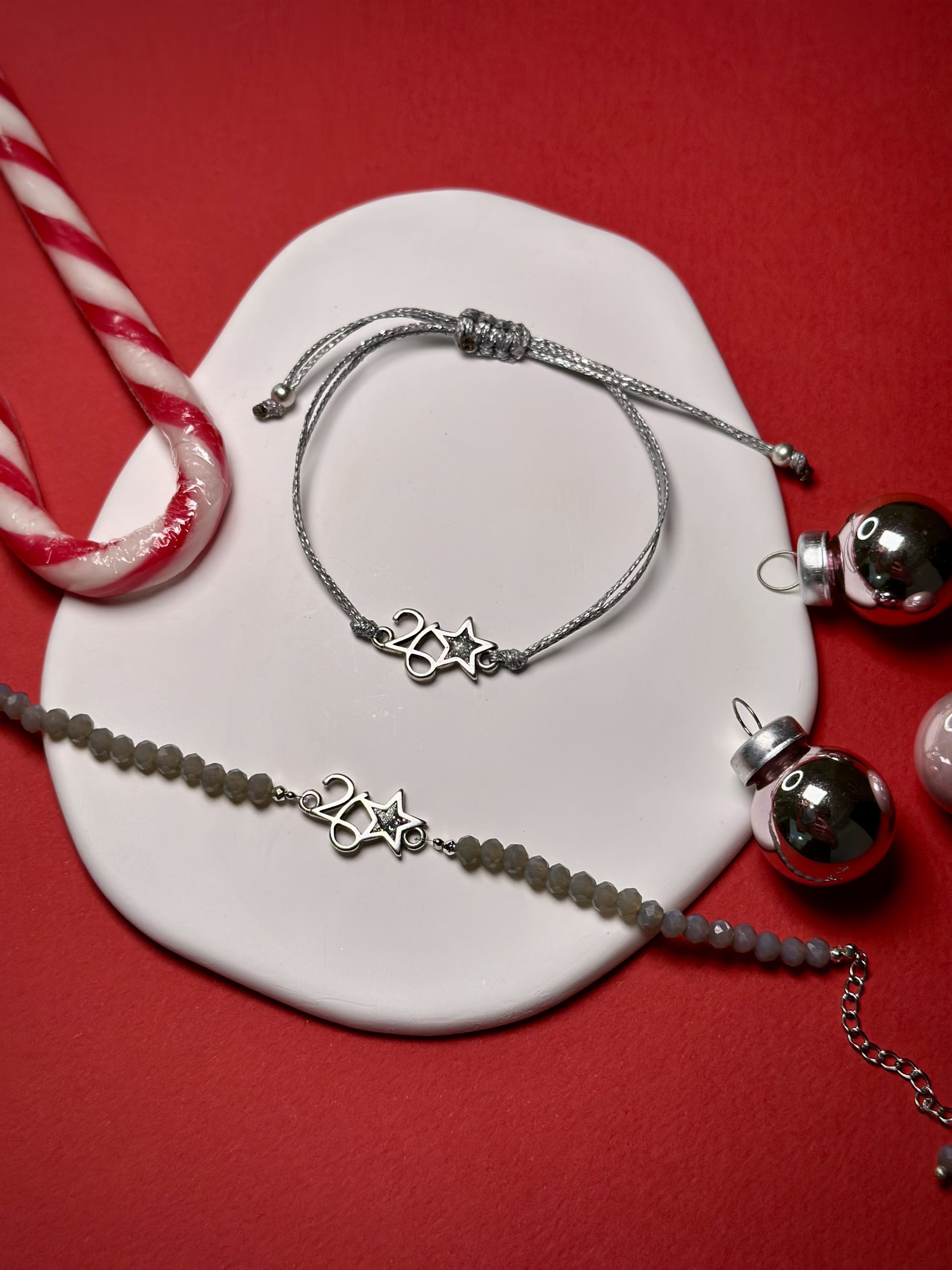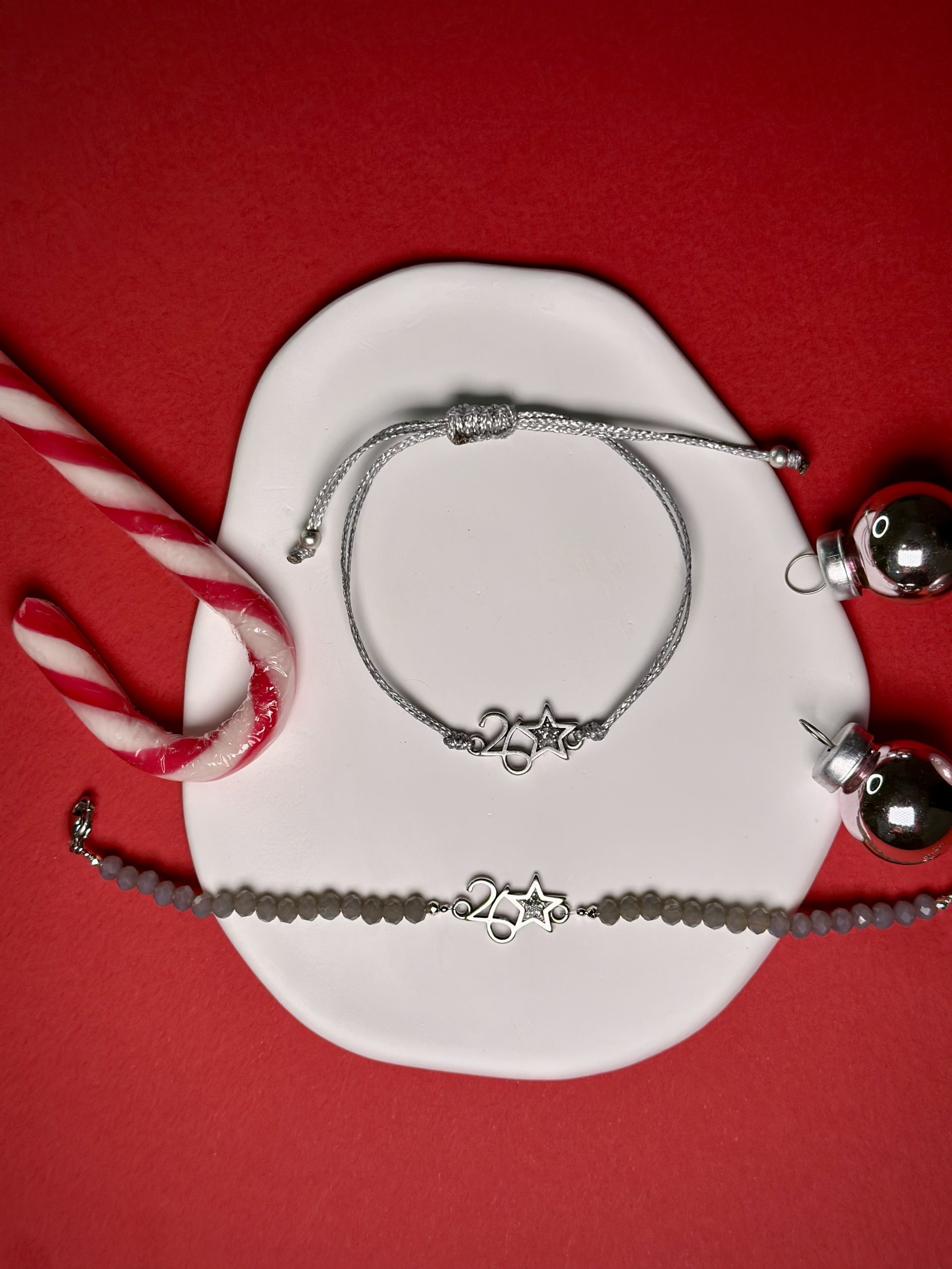 Το δεύτερο βραχιόλι, ελαφρύ και καθημερινό, είναι δεμένο με ασημί κορδόνι υψηλής αντοχής. Το κεντρικό μεταλλικό charm 26 με αστεράκι ταιριάζει αρμονικά με το χρώμα του κορδονιού, ενώ το μακραμέ κούμπωμα επιτρέπει εύκολη αυξομείωση, ώστε να προσαρμόζεται τέλεια σε κάθε καρπό.