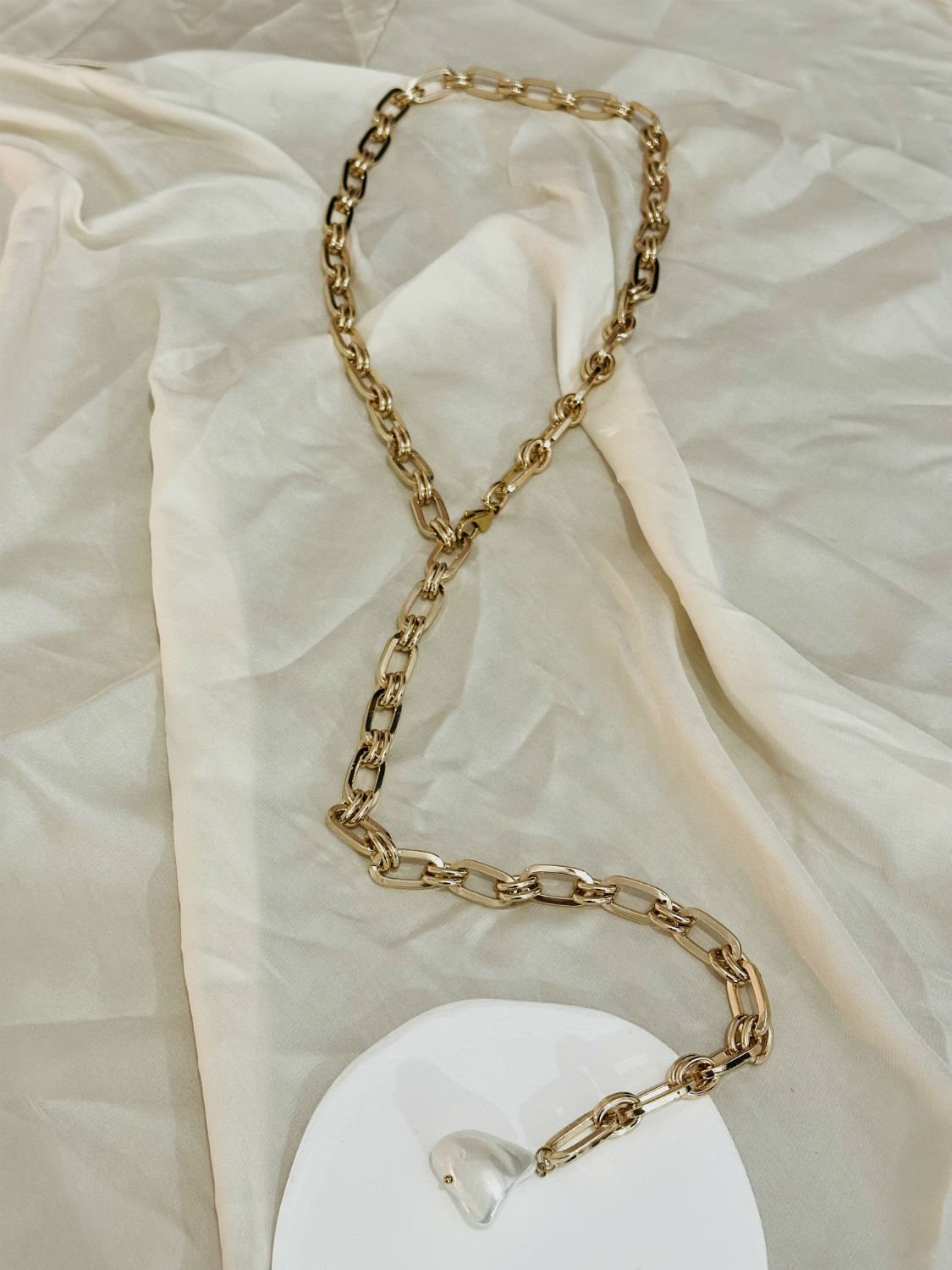 Ατσαλένια, χονδρή αλυσίδα, μακριά πάνω από 100 εκατοστά, που αγκαλιάζει το σώμα με σιγουριά και δύναμη.